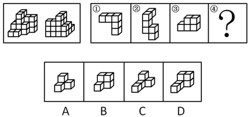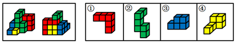 下图为同样大小的正方体堆叠而成的多面体正视图和后视图。该多面体可拆分为①、②、③和④共4个多面体的组合,问下列哪一项能填入问号处?