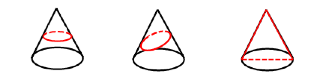 a.圆(横切);b.椭圆(斜切);c.三角形(竖切过顶点)