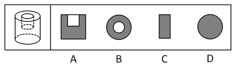 B项:图形下方的立方体上横切、斜切都无法得出此形状,竖切应是完整矩形;上方的圆柱体,从上往下竖切,可得到矩形截面,但一刀切到底,截面两侧应有2个“凸起”部分,而且大圆柱体内部“打通一个圆柱孔”说明“圆柱孔”中间部分应无线,无法切出,当选;