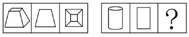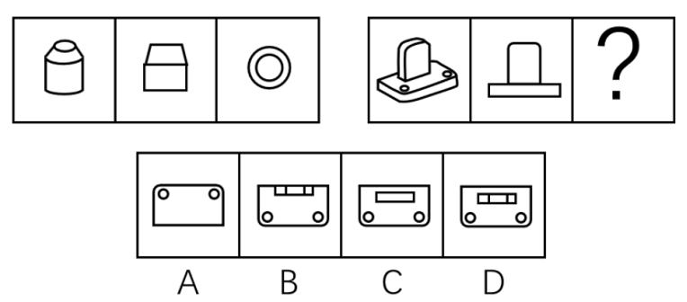 【题目分析】第二组应用与第一组相同或相似的规律,?处图形应为第二组第一个立体图形的俯视图。从上往下看,可以看到两个小圆和一个矩形面,只有C项符合。