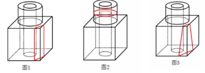 如图所示,立方体上叠加圆柱体再打通一个圆柱孔,然后从任意面剖开,下面哪一项不可能是该立体的截面?