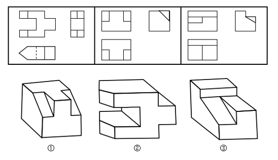 【题目分析】三视图分别是三个立体图形的主视图、俯视图和左视图。只有立体图形①的俯视图能看到一个“凸”字形面和左右两个小矩形,故图①对应的是第二个三视图,排除C、D两项;立体图形②上下相同,其正视图也应该是上下长得一样,对应的是三视图的第一个,排除B项;验证A选项,立体图形③的俯视图应该有一个长矩形和两个竖着的矩形,可与三视图的第三个相对应,A当选。