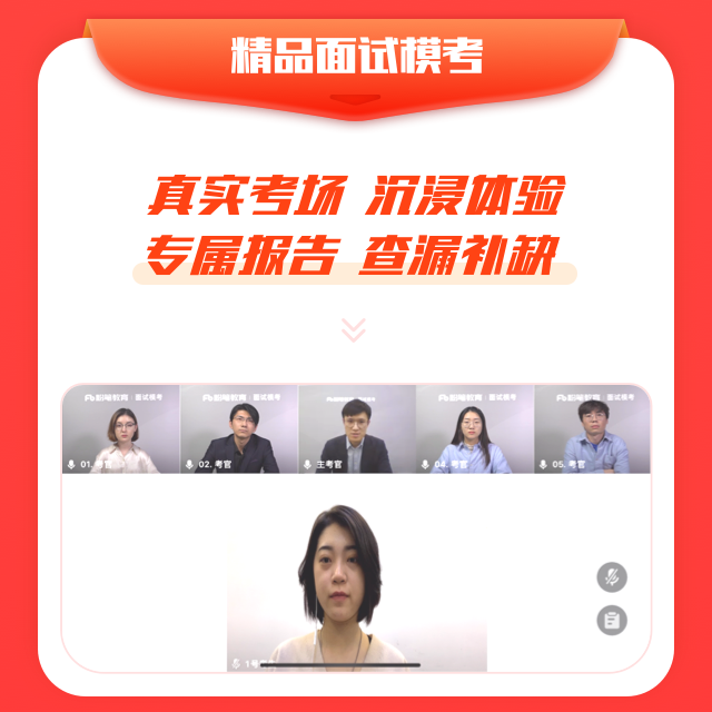 这时,精品面试模考开始了。好家伙,一进去,5个考官对着我,只有我一个人的脸又大又尴尬。紧张得都答非所问了,只考了70分。