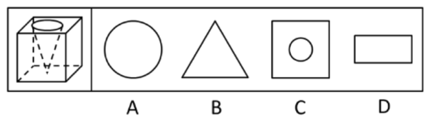 例:一立方体如图所示从中挖掉一个圆锥体,然后从任意面剖开,下面哪一项不可能是该立方体的截面: