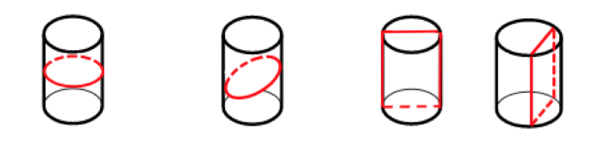 2.圆柱、圆锥、圆台横着切均是“圆”,斜着切均是“椭圆”。需要特别注意的是圆柱从上向下斜着切两侧是曲线,而不是直线。
