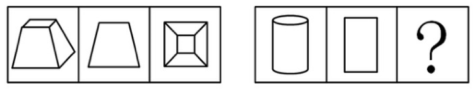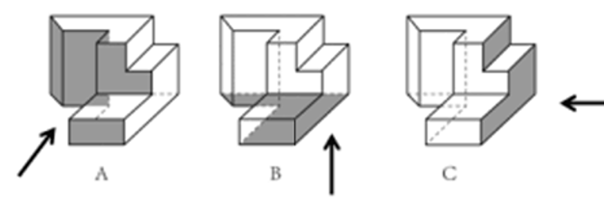 三视图题目的提问方法虽然与图形推理中平面规律的提问方法相同,但题干图形的特征较为明显,通常会出现一个立体图形和两个三视图,且题型多为两组图形式。