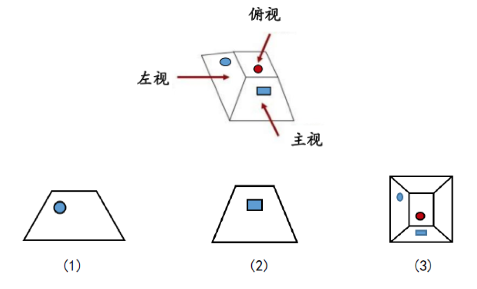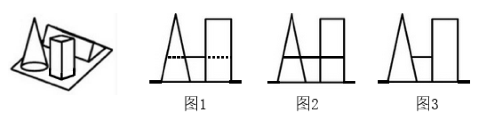 如上图所示,图1、图2以及图3都是从立体图形左前方往右后方观察的,需要分两种情况进行讨论:①若只有图1和图2,得出的应是图1,因为后面的矩形应被前方的图形遮挡,被遮挡的部分应用虚线表示;②若只有图2和图3,得出的应是图3,被遮挡的部分用虚线表示最严谨,若没有用虚线表示,则遮挡的部分应不画出来。