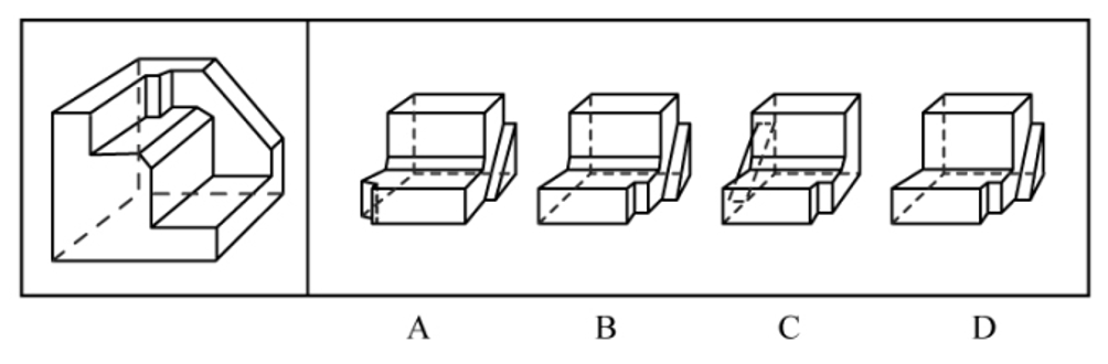 正方体切掉一块后剩余部分如下图左侧所示,右侧哪一项是其切去部分的形状?