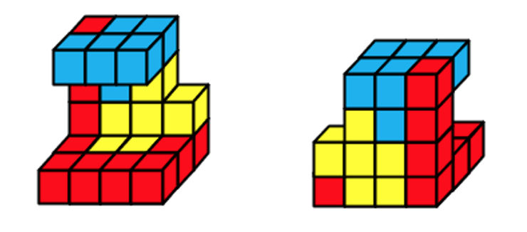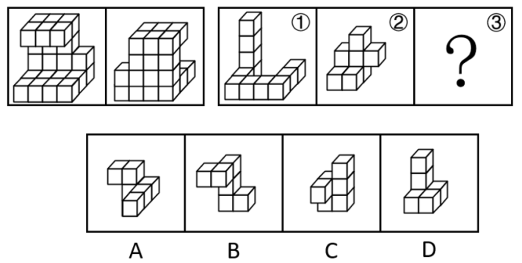 左图给定的是由相同正方体堆叠成的多面体的正视图和后视图。该多面体可以由①、②和③三个多面体组合而成,问以下哪一项能填入问号处?