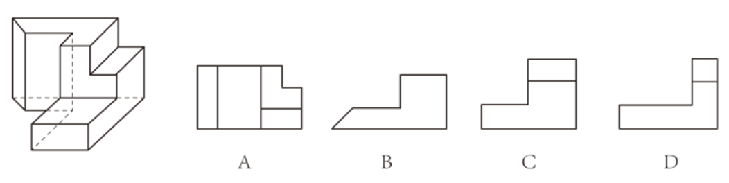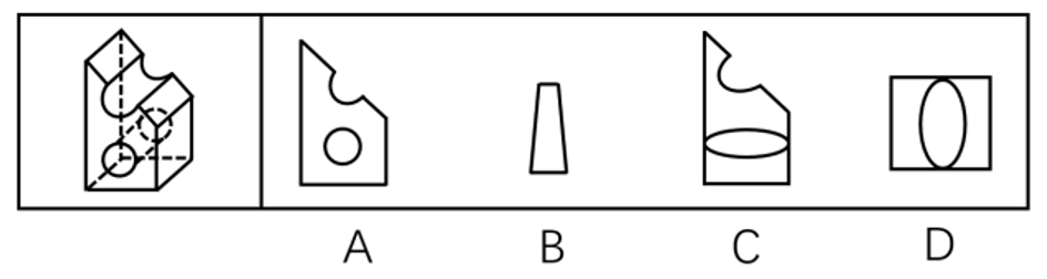 A项,从前往后观看,可以看到,为主视图,本题为选非题,排除;B项,从下往上观看,可以看到,为仰视图,本题为选非题,排除;C项,从右往左观看,可以看到,为右视图,本题为选非题,排除;D项,无法得到。