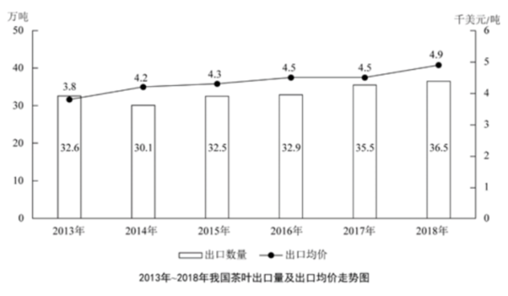 2018年全球茶叶产量585.6万吨,同比增长约3%,中国茶叶产量261.6万吨,同比增长0.7万吨。2018年,中国茶叶国内销售量为191万吨,同比增长5.1%,国内销售总额为2661亿元,出口量为36.5万吨,同比增长2.8%,出口总额为17.89亿美元(合人民币120亿元),同比增长(?)。