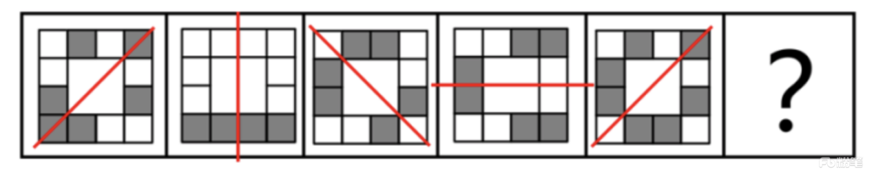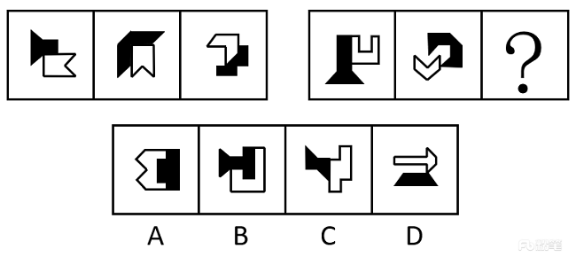 【题目分析】元素组成不同,优先考虑属性规律。观察发现,图形中黑白块数量不同,但整体较为规整,考虑对称性。题干图形均只有1条对称轴,且对称轴方向每次逆时针旋转45°,故?处应为只有1条对称轴的竖轴对称图形,只有A项符合,当选。