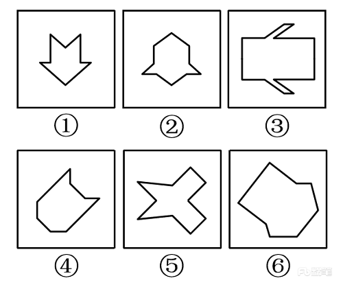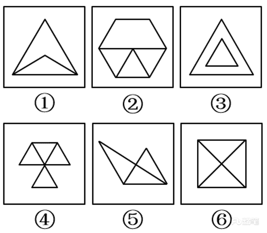 【题目分析】本题为分组分类题目。元素组成不同,无明显属性规律,考虑数量规律。观察发现,图①和图⑥分别为“日”字、“田”字的变形图,考虑笔画数。图①④⑤为一笔画图形,图②③⑥为两笔画图形。即图①④⑤一组,图②③⑥一组。