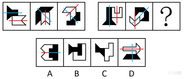 【题目分析】元素组成不同,优先考虑属性规律。观察可知,题干图形比较规整,考虑对称性。图①②⑤一组,对称轴穿过图中的两个交点;图③④⑥一组,对称轴穿过图中的两条线,并且这两条线和对称轴垂直,对应A项。