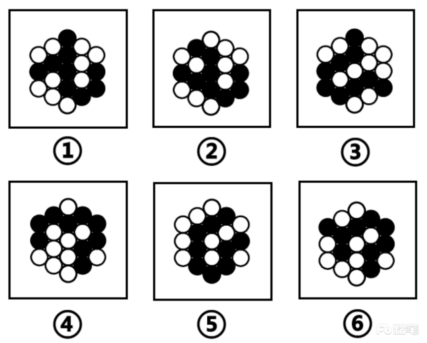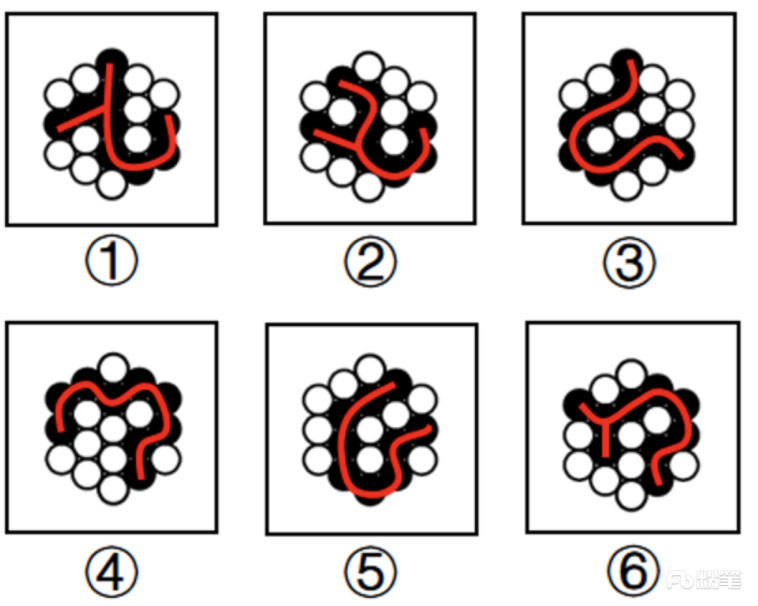 【题目分析】元素组成相同,但无明显位置规律。观察发现,所有图形中黑球全部相连,如果将所有黑球连成线,图③④⑤中所有黑球连成的线能一笔画成,而图①②⑥中所有黑球连成的线存在4个奇点,为两笔画成,如下图所示。因此,图①②⑥一组,图③④⑤一组。