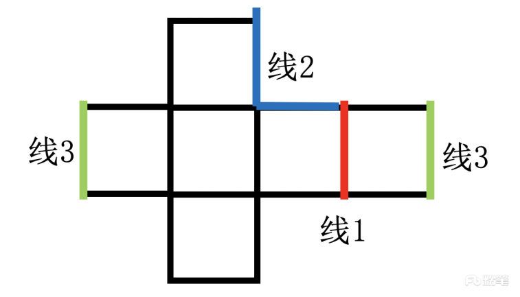 (3)一列/行连着4个面,最两侧的两条边是同一条边(如图线3所示)。