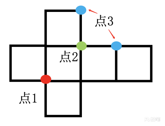 (2)展开图中构成直角的两条边的两端的两个点分别是公共点(如图点2和点3所示)。