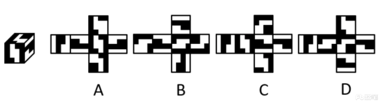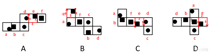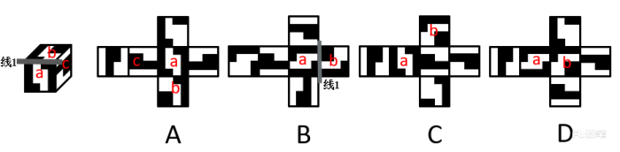 【题目分析】将选项展开图标上序号,如下图所示(各选项面都相同,故相同的面用相同字母表示),逐一进行分析。