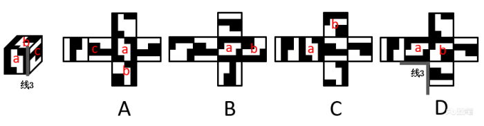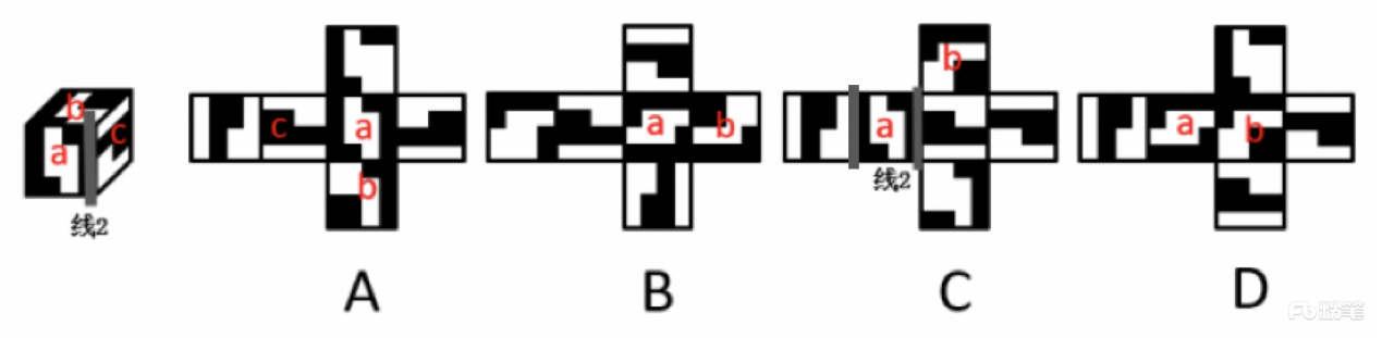 C项:选项中面a与相邻的两个与面c一样的面的公共边(如下图线2所示)都没有挨着较细的黑色部分,而题干立体图中面a与面c的公共边(如下图线2所示)挨着面c较细的黑色部分,选项与题干不一致,排除;