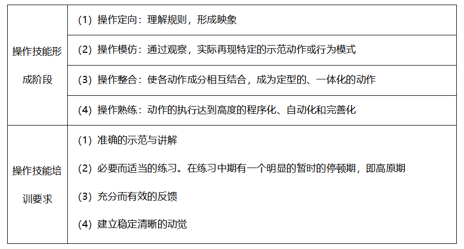 在这一阶段,操作技能主要发生以下两类变化:一是先前流畅性和节奏感较差的部分技能逐渐变得富有节奏和流畅;二是一些个别的子技能被整合为互相协调一致的、稳定的总技能。例:要给螺丝拧上螺帽,就需要“选择合适的螺丝”“并把它放在合适的位置”,两个步骤要能发生自然的联系,动作之间形成连锁。