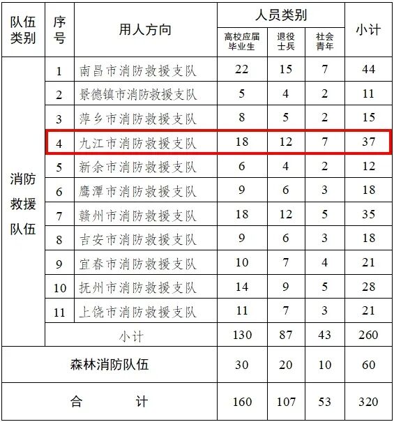 经应急管理部、人力资源社会保障部、退役军人事务部批准,今年江西省国家综合性消防救援队伍共招录消防员320名,均为男性,其中:消防救援队伍260名(高校应届毕业生130名、退役士兵87名、社会青年43名)、森林消防队伍60名(高校应届毕业生30名、退役士兵20名、社会青年10名)。具体见附件1。